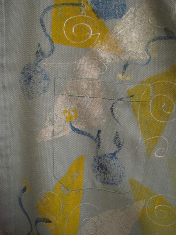 Světlounce zelená košile a dlouhým rukávem ve vel. XXL je malovaná žlutou, bílou a modrou kombinací barev. Vyjadřuje očekávání jarní nálady, svěží trávy, sluníčka i květinek.