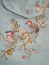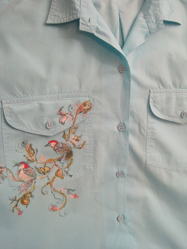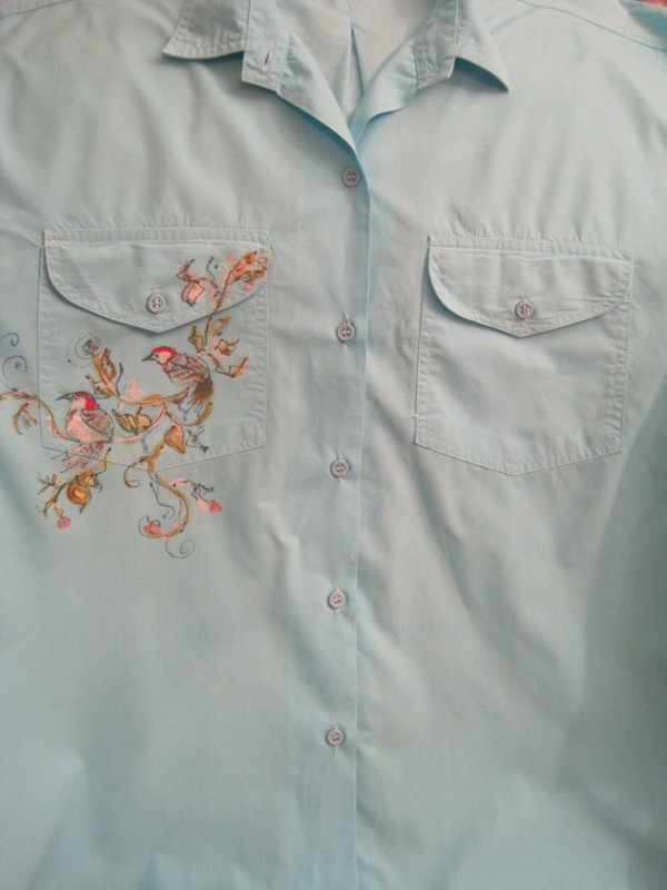 Dámská sportovně elegantní košile má vpředu dvě kapsičky. Na jedné kapsičce je malován motiv ptáčků a přírody.Límeček má vzadu zapínání na přesku.