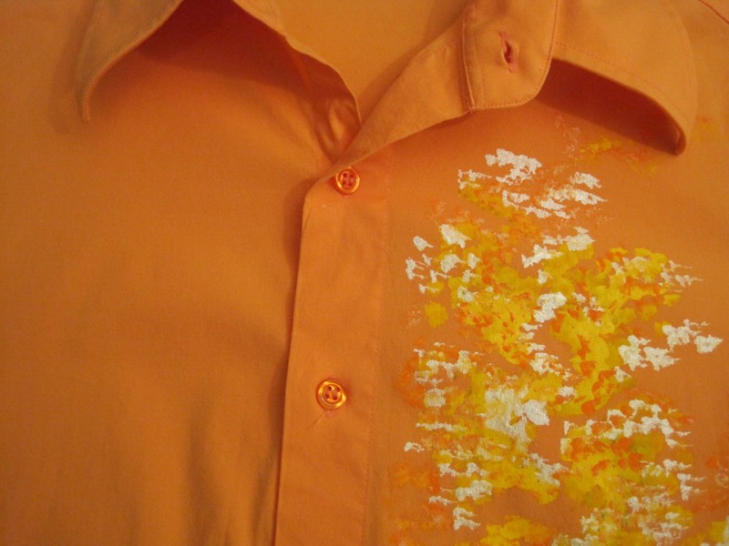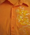 Dámská halenka s dlouhým rukávem je v oranžové barvě a optimismus a sluníčko sálá z ruční malby ve žluté a bílé na předním díle halenky. Dává naději a prosluní každý den. Halenka je elastická, má složení bavlny a 5% elastanu.
