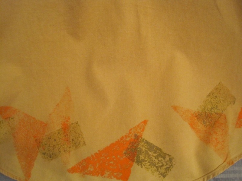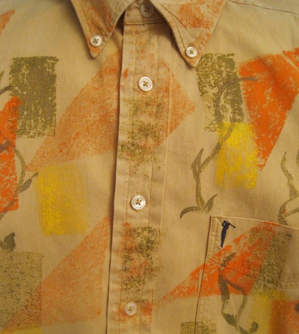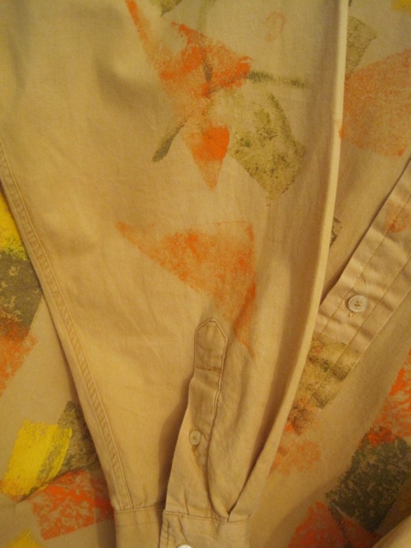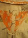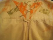Bavlněná košile zn. Peter Michael má dlouhý rukáv a je v barvě béžové s nádechem žluté, vel. L.Je ručně malovaná na předních dílech, rukávech, vzadu pod límečkem a spodní části košile.