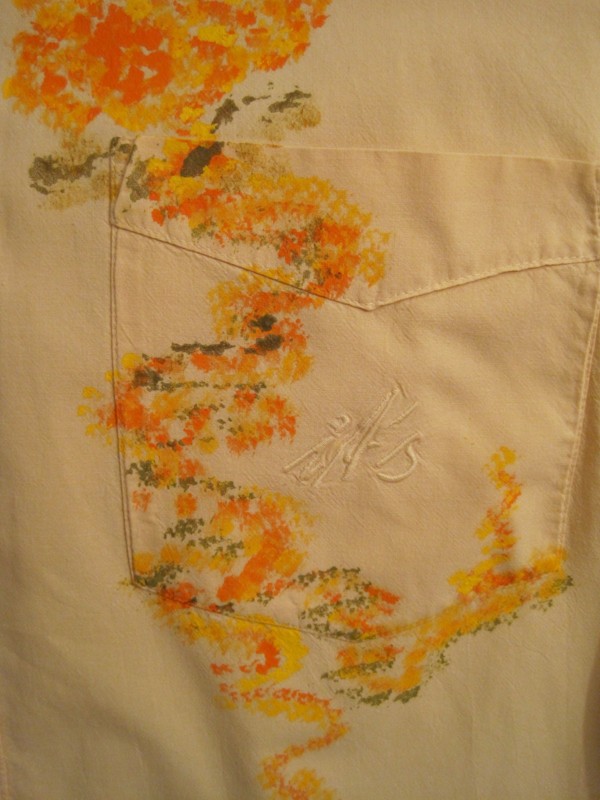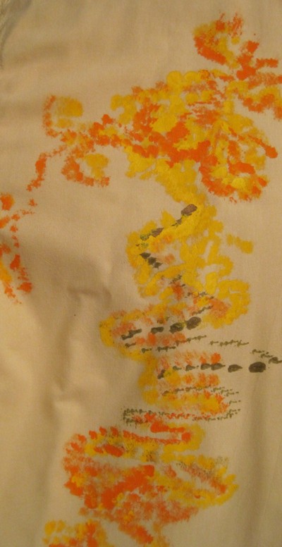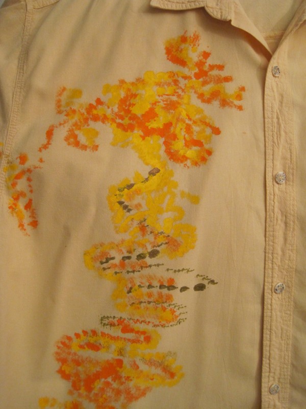 Veselý den, tak jsem nazvala světle žlutou košili s krátkým rukávem ve velikosti XL.Je 100% bavlněná, dovoz Portugalsko.K malbě na košili jsem použila veselé barvy, které prozáří náladu nového dne.